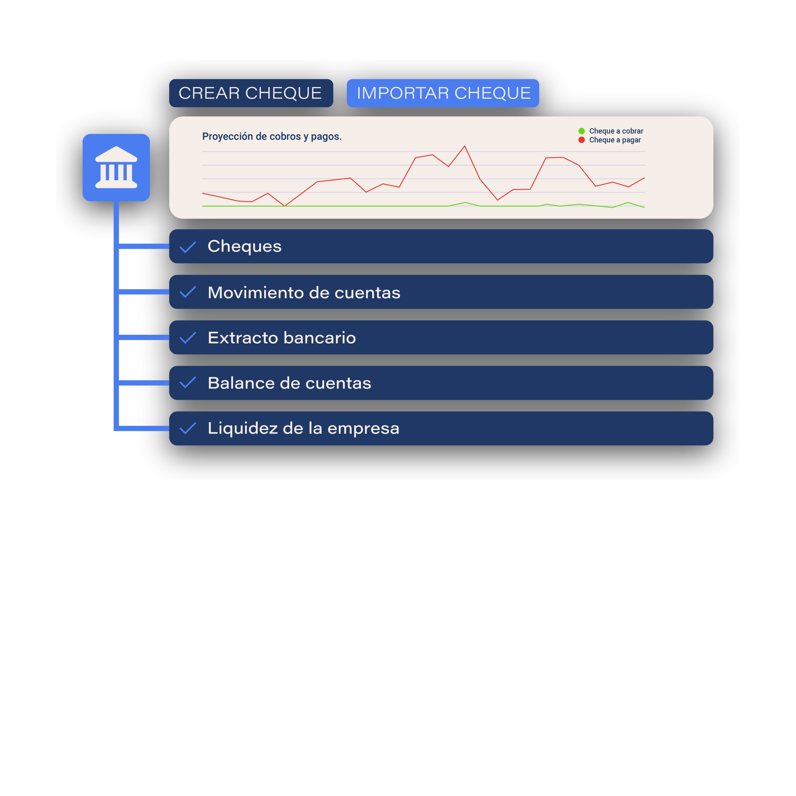 - Controla todo lo relacionado con cheques: emisión, depósito y seguimiento.